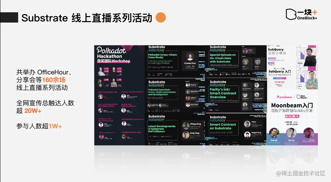 从 2018 年创立至今已开设 16 期Substrate系列开发、Moonbeam入门、SubQuery 入门等系列课程,截止目前为止我们已经培育了超过 3000 位 Substrate 开发者加入课程的学习,全网课程视频播放量超 15 万!波卡生态早期项目的创始人、CTO、核心开发者大部分都来自 OneBlock。OneBlock 团队真正擅长的是「技术课程+社区」,并且我们认为在区块链中,技术社区是一切的出发点。“运营+技术” 是早期可以把生态搭建起来的最稳定的架构。