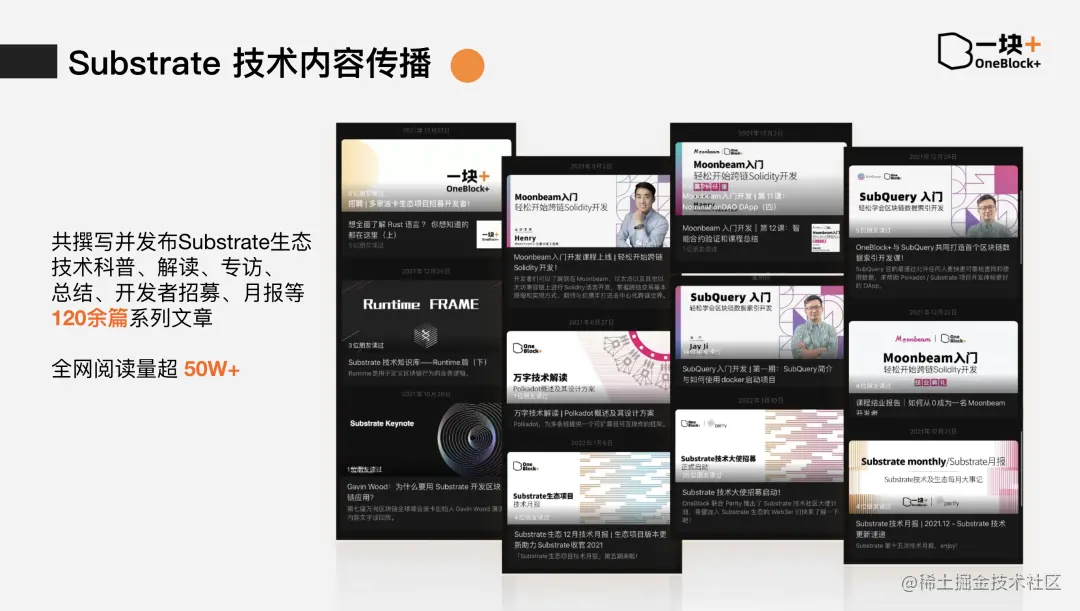 我们还会定期撰写并发布与 Substrate 相关的技术内容,例如技术解读、科普、人物专访、月报总结等内容在 Oneblock Community 公众号和 Medium 平台上。过去的一年里 OneBlock 共发布了 120 多篇技术文章,全网阅读量超 50 万。