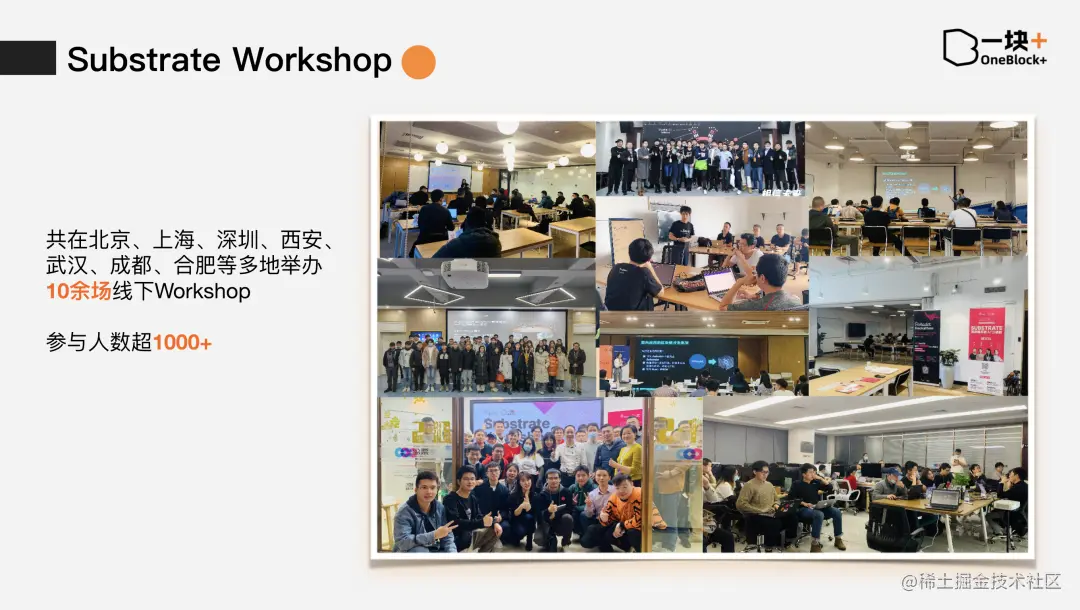 One Block+ 是中国最大的 Substrate 技术开发者社区,也是 Parity 在亚洲唯一的运营合作伙伴,波卡生态早期项目的创始人、CTO、核心开发者大部分都来自 One Block+ 社区。