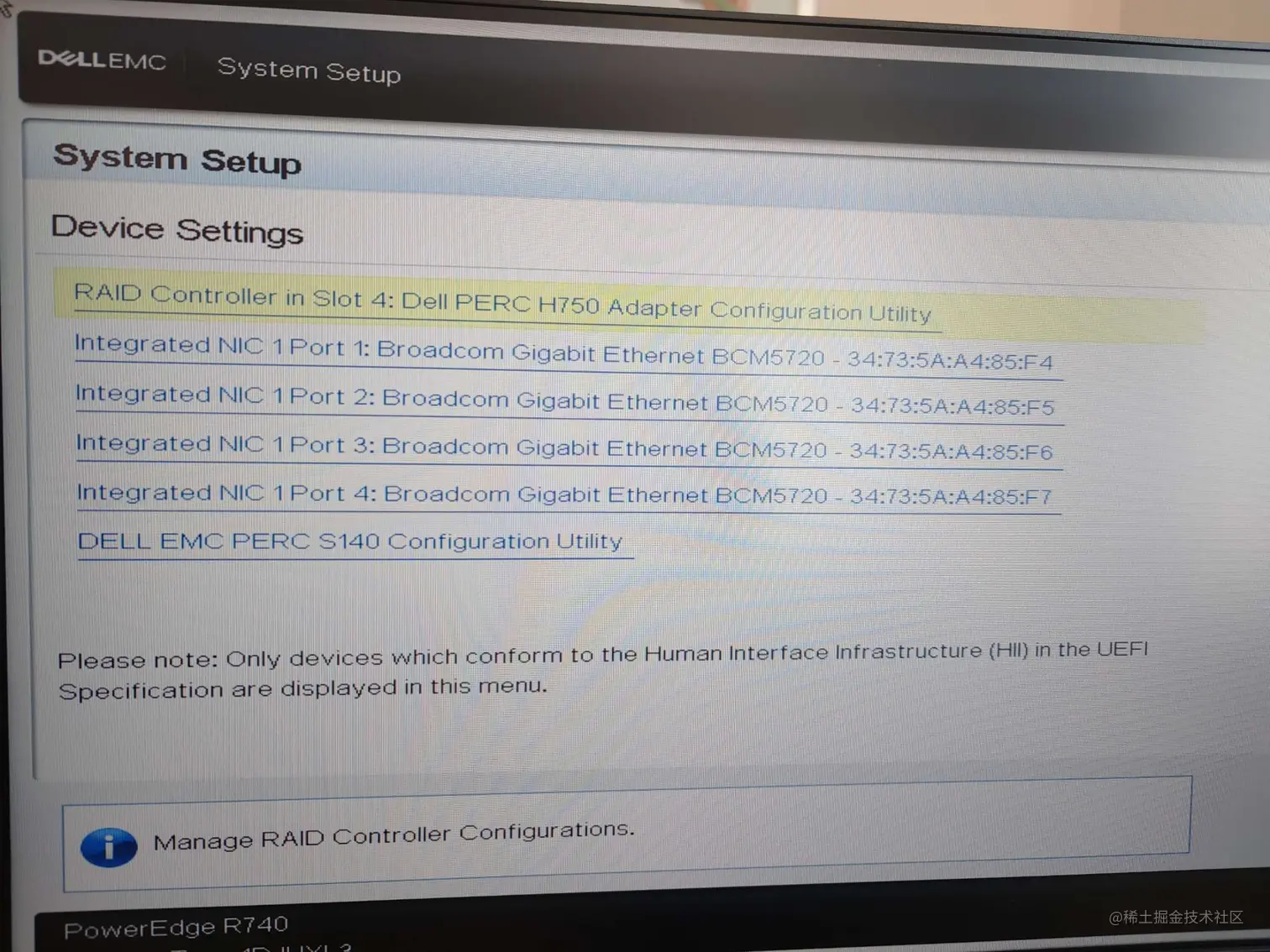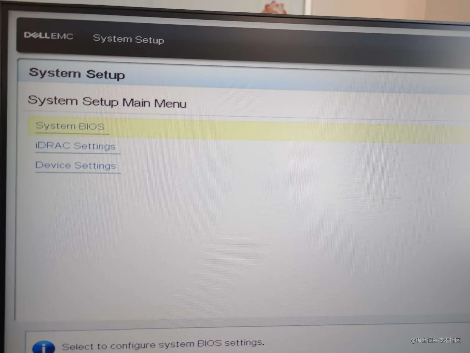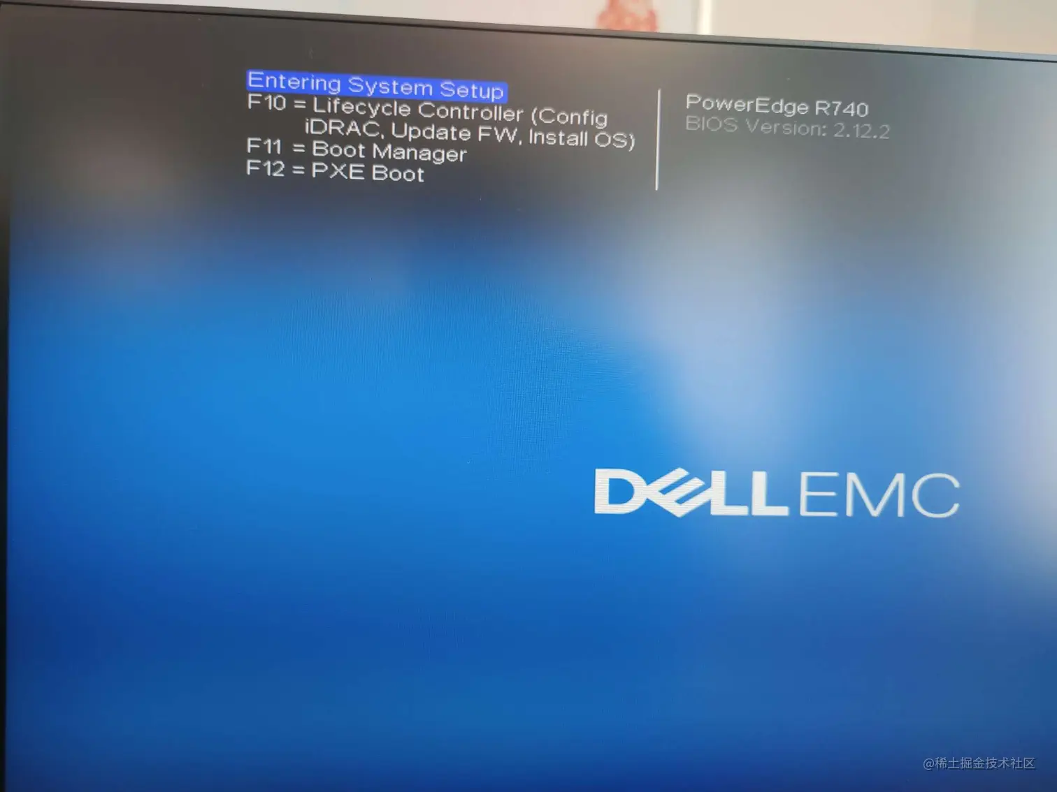 这是一台Dell的R740服务器,同类型R系列产品操作类似,上电后等待自检,到出现此页面时按下键盘的F2,进入BIOS配置页面。