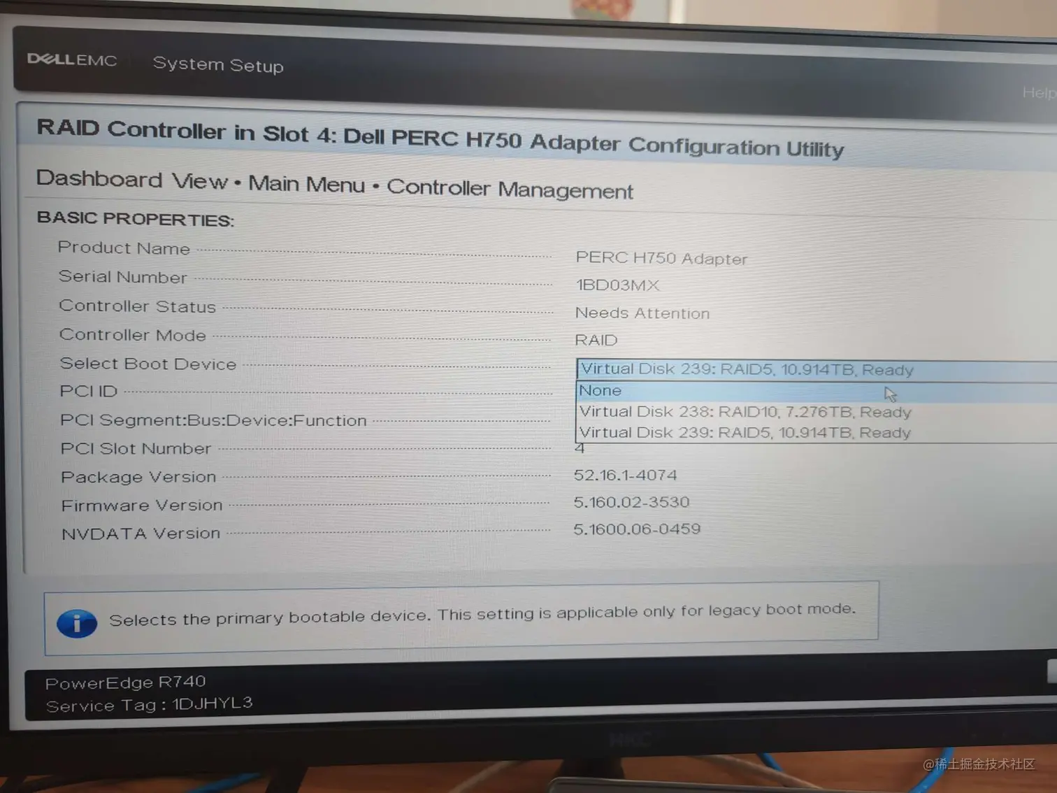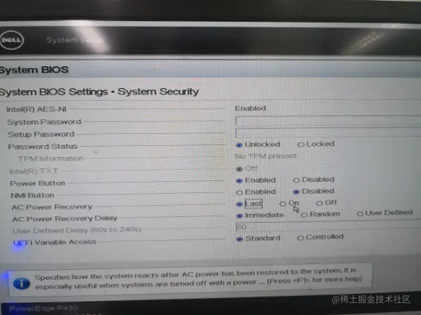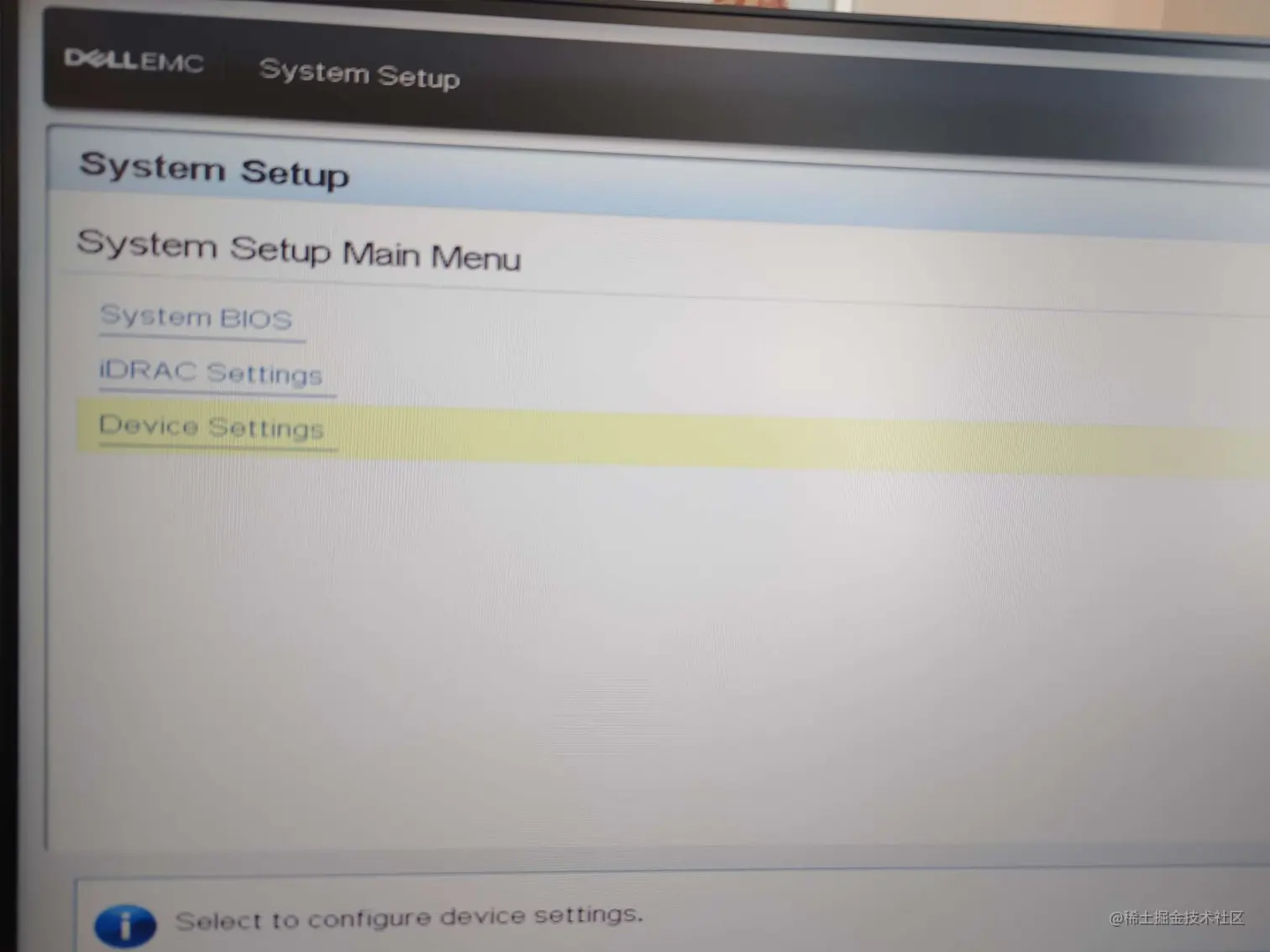 这是一台Dell的R740服务器,同类型R系列产品操作类似,上电后等待自检,到出现此页面时按下键盘的F2,进入BIOS配置页面。