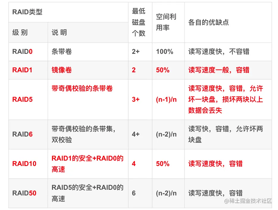 当然想知道具体的各种Raid的最低磁盘个数和空间利用率,可参考下面的表格。