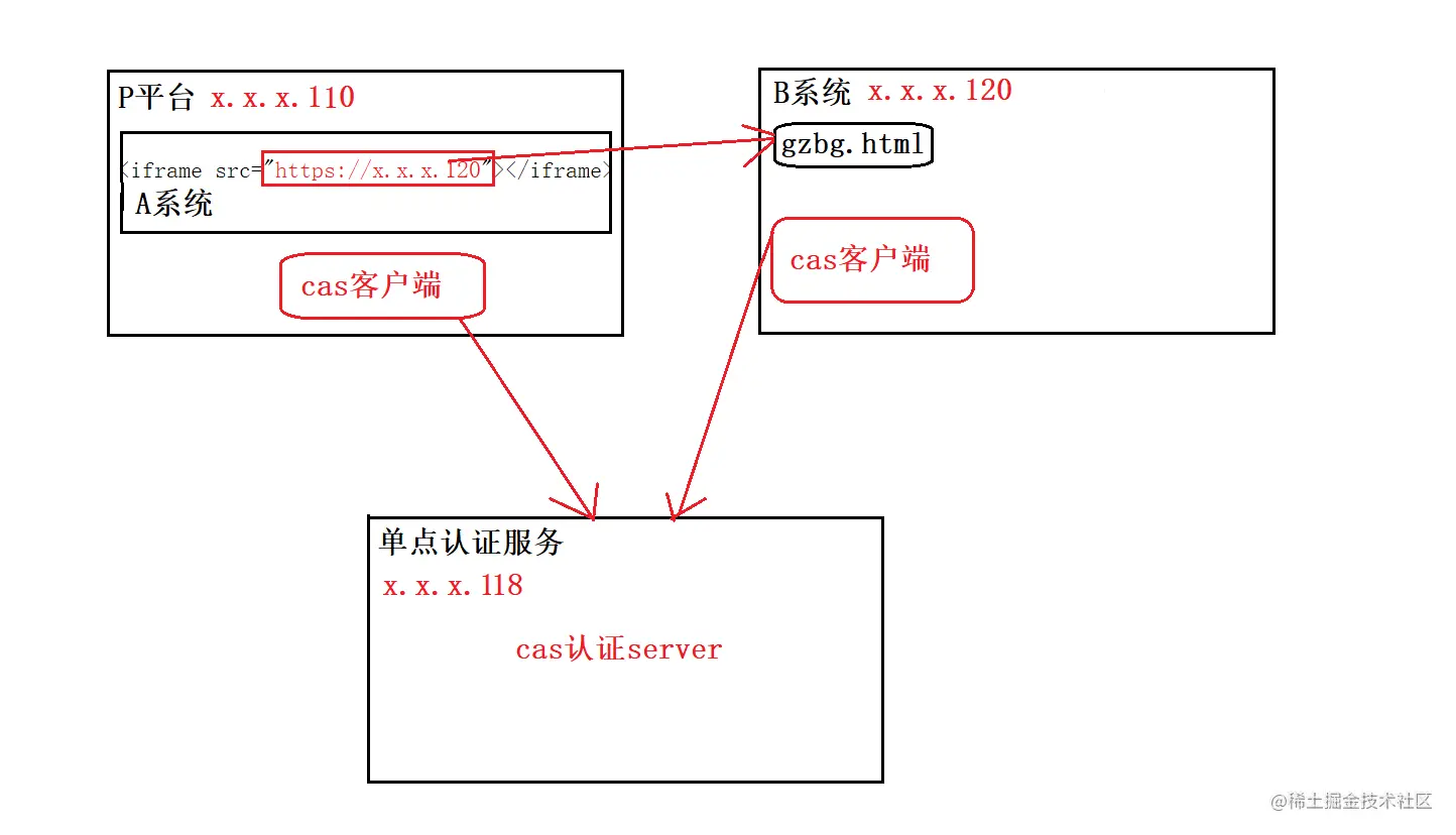 项目背景:客户既有的等待升级的P平台(用户、权限等已经具备),如无特殊说明,下文所有的p都是指P平台。p升级内容的一部分功能是原有的p平台团队负责,此处称作A系统,我们负责p平台升级的另一部分内容,称作B系统。因为整个系统的入口在p平台,A项目也是基于p平台研发的,所以最后,按照客户的需求和两个团队的商定,最终的方案是A系统通过Iframe嵌入B系统的页面,进而实现整个系统的完整。但是这一方案也为后面的项目推进埋下了不少问题。另外为了解决用户不用重复登录登出的问题引入了CAS单点登录以及认证,下文会有详细说明。
