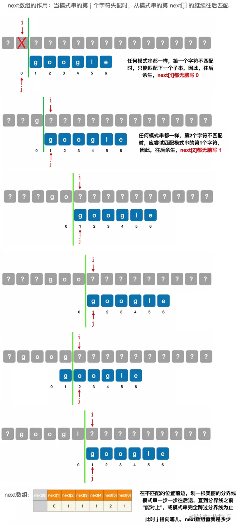 在朴素模式匹配算法中,每次子串与模式串比较失败后,指针都回溯到新的子串起始处与模式串起始位置重新开始依次比较。但是通过前一次的比较,子串与模式串中的内容我们是知道的,所以不需要每次都从头开始重新比较。根据规律可以分析出当模式串的第几个字符匹配失败后下一次应该从第几个字符开始比较。