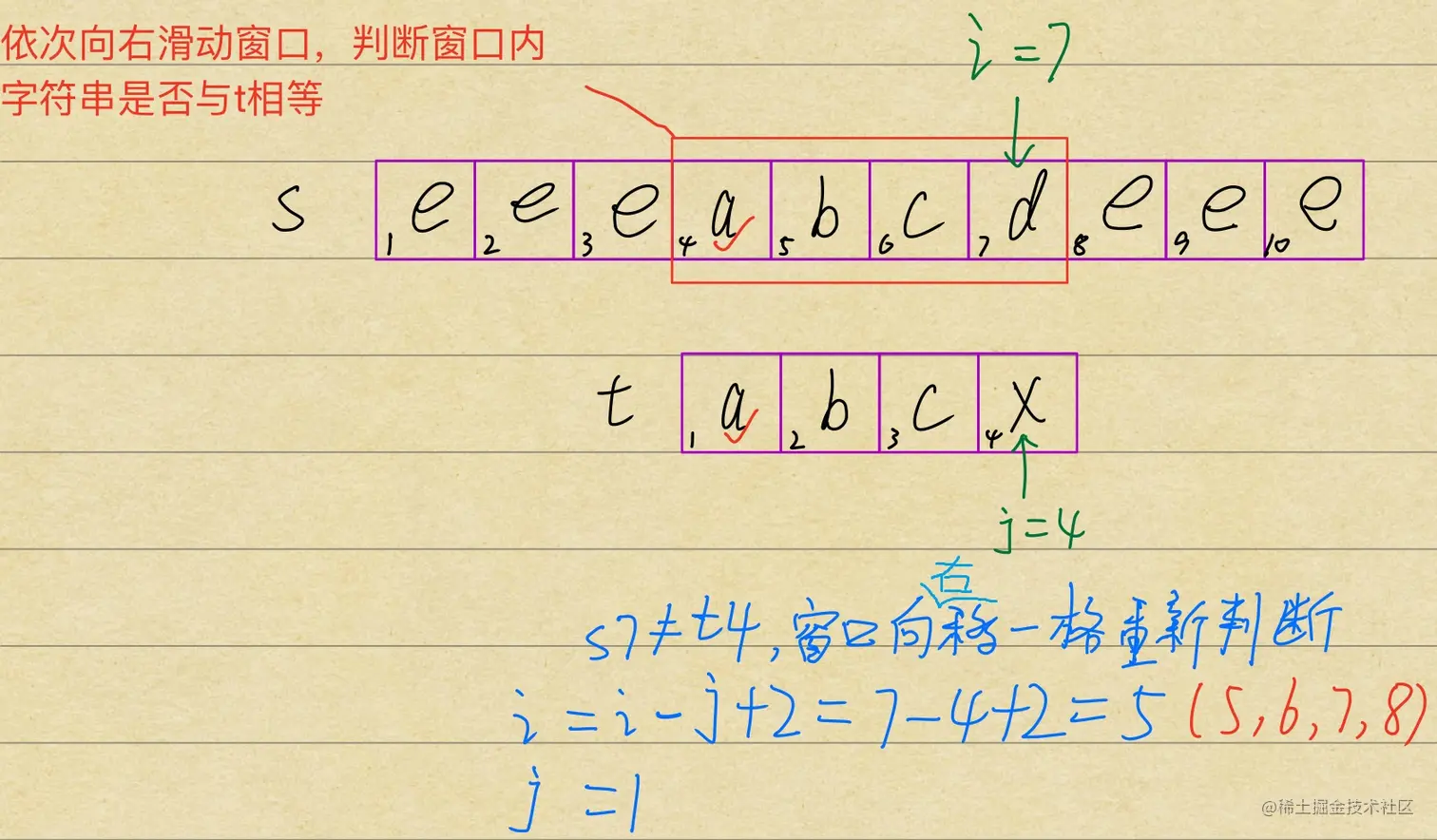 从主串s中依次划出与子串 t 中大小相等的串,判断窗口与子串是否相等,不相等时窗口向右移动一格再判断,直到找出相应的子串或找不出对应的串为止。