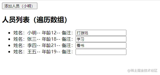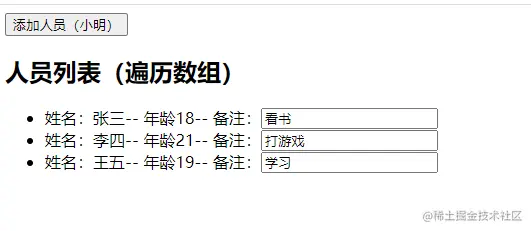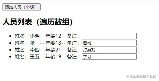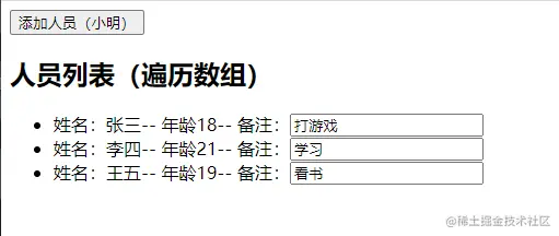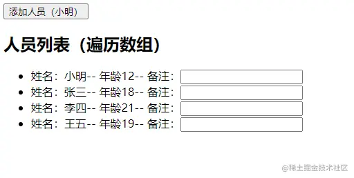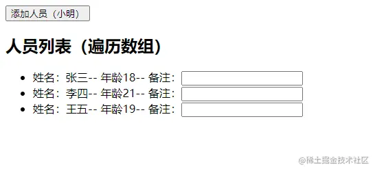 为了能引出key的原理以及作用,我通过一个问题引出,假如每一个人的备注项输入框都输入上内容,然后再添加一个人员,就会存在以下问题