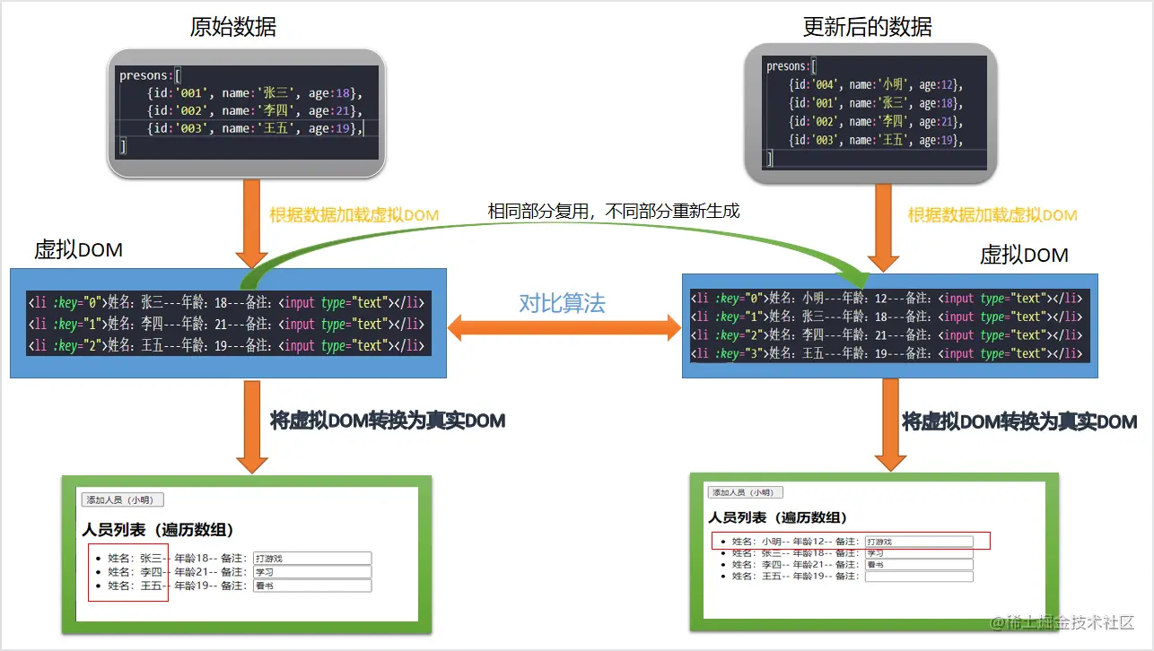 在数据更新过后,新旧虚拟DOM会运用对比算法进行对比,而对比的前提就是key这个唯一标识符,通过key对比前后数据的变化,如果对比之后不一致的内容就不能复用, 只能把新的虚拟DOM转化为新的节点,当数据无改动时,则复用之前数据,然后再转化为真实DOM,也就是呈现在页面的内容。
