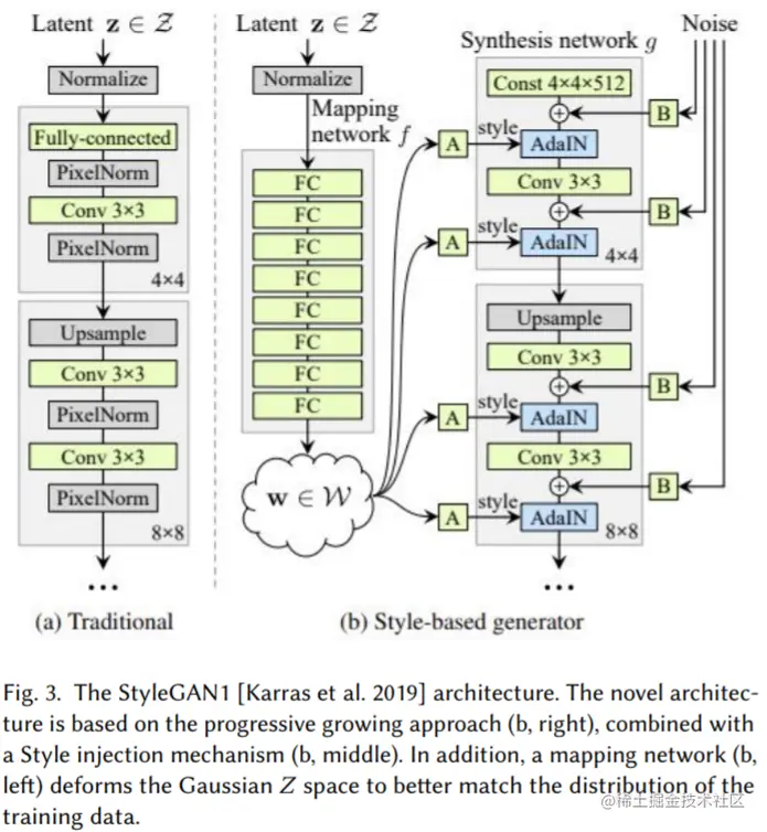 StyleGAN1。基于风格的生成器架构,或简称 StyleGAN,最初由 Karras 等人在 2019 年提出。StyleGAN 架构的核心是风格调制层(style modulation layers),StyleGAN 的名字就是从这里得来的, 其能够生成高质量的图像数据并且做到了高层特征可控。