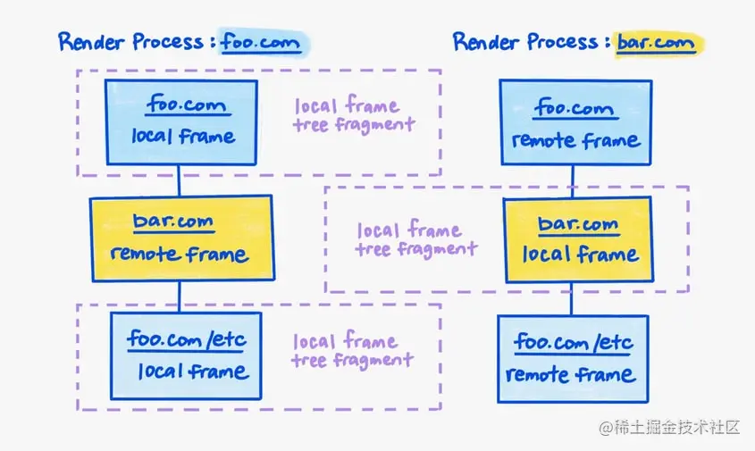现在仍然只有两个渲染器,但有三个本地框架树片段,两个在 foo.com 的渲染进程中,一个在 bar.com 的渲染进程中: