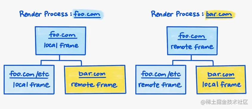 在不同进程中渲染的框架表示为远程框架(remote frame)。远程框架只包含占位所需的最少信息,例如其尺寸。除此之外,远程框架不包含渲染实际内容所需的任何信息。