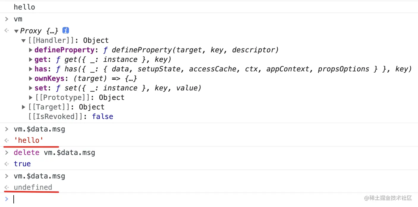 可以看到区别,vue2中需要去遍历属性,拦截的是修改obj[key]和读取obj[key],而proxy代理的是整个对象,不需要给定key值,这就是为什么能够动态新增属性的原因。还可以在Proxy中拦截更多的操作符,定义一些其他被代理对象上的自定义行为,如deleteProperty拦截delete操作符,这样便可以监听属性的删除操作。