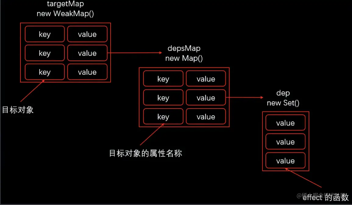 在proxy的get中需要track收集依赖,set和deleteProperty中需要派发更新,那么需要考虑的是收集依赖的时候如何存放依赖呢?这里和vue2中defineProperty最大的区别是,vue2中循环遍历对象每个key时,在getter中收集依赖;vue3中对应的是整个对象,同样地,要收集对应属性的依赖。这里使用这样的结构来存储。