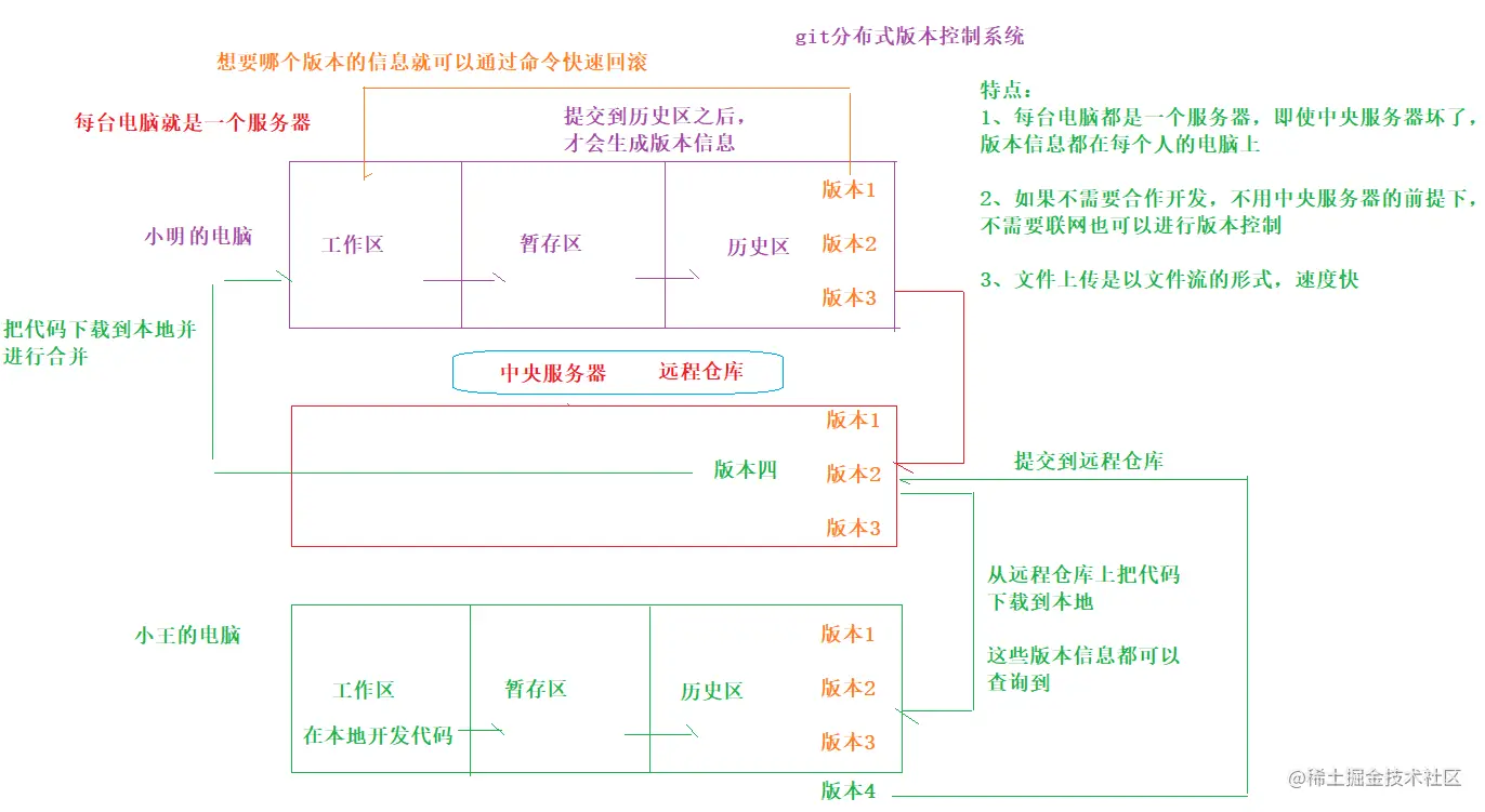 - 每台电脑都是一个服务器,即使中央服务器坏了,版本信息都在每个人的电脑上了