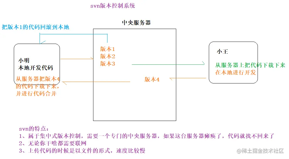 - 属于集中式版本控制,需要一个专门的中央服务器,如果这台服务器瘫痪了,代码就找不回来了