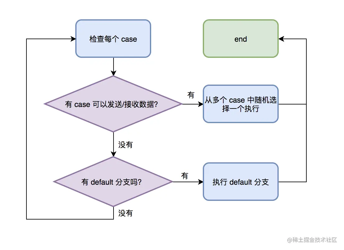 - 随机性:多个 case 之间并非顺序的,遵循「先到先执行,同时到则随机执行」的原则