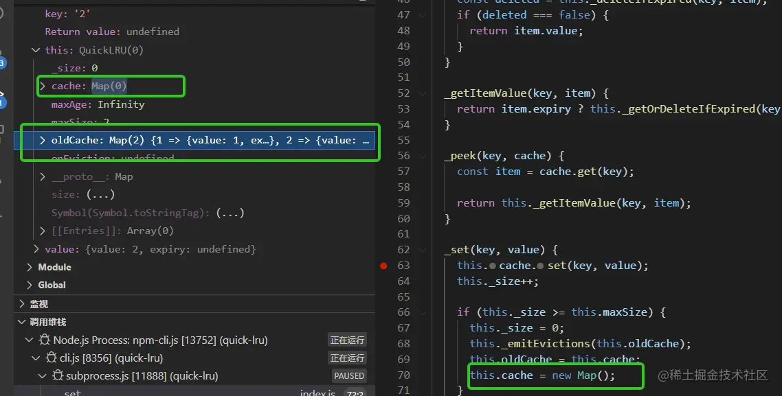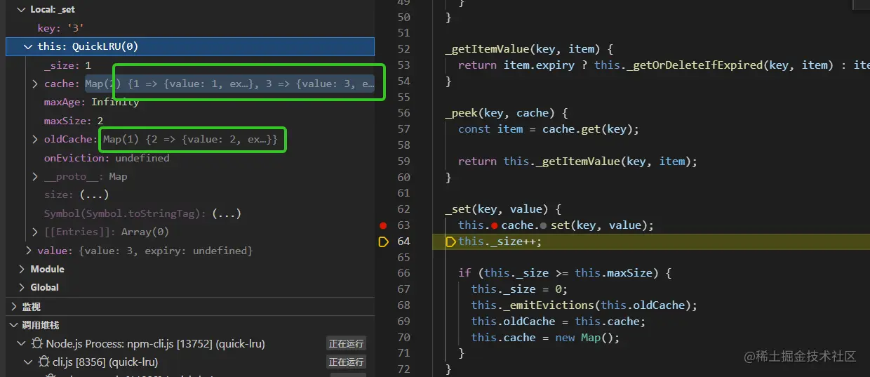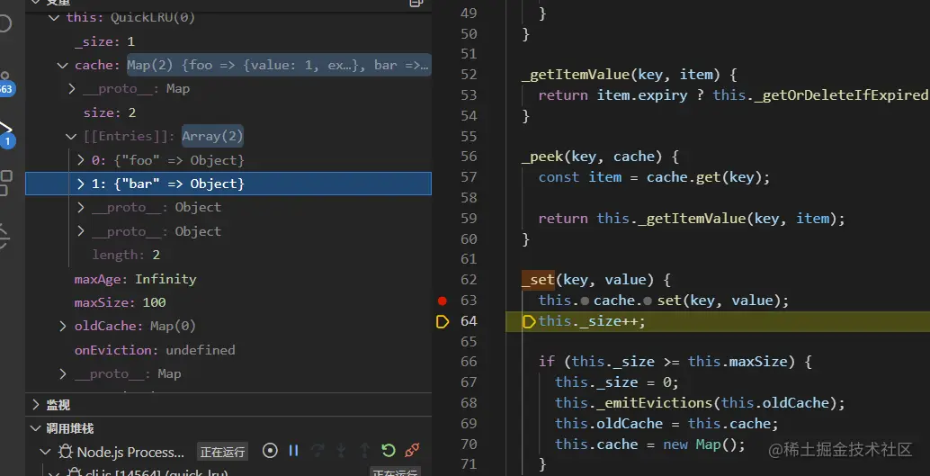 测试用例是test.js (quick-lru/test.js),以两个测试用例的执行过程来加深对quick-lru的理解,关于如何调试可以参考川哥的文章(juejin.cn/post/703058…)。