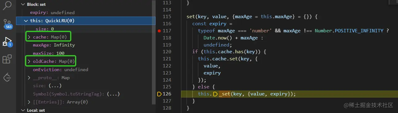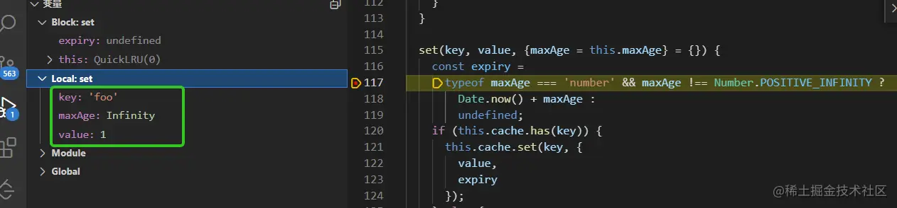 测试用例执行到lru.set('foo', 1)时会调用set方法,此时key为foo, value为1,由于没有指定maxAge所以maxAge值为Infinity,如下图: