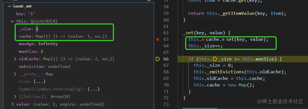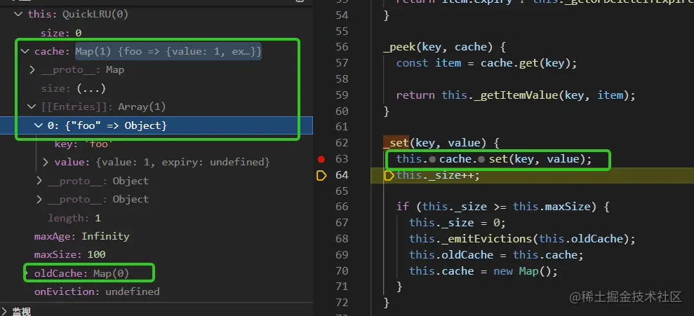 _set接着往下执行,此时_size大于maxSize所以oldCache赋值为cache, cache初始化为新的map, 如下图所示: