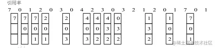 (4)当引用页面2时,没命中(没在存储空间中),存储空间没有位置(专业术语叫“缺页”),由于7是最近没有用的,把它置换出去,2放进去;