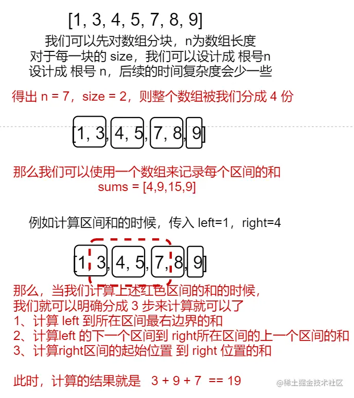 空间复杂度的话,咱们是引入了一个 sums 数组和 ,咱们 sums 的数组长度,取决于咱们切割数组的份数,因此是 O(根号n)
