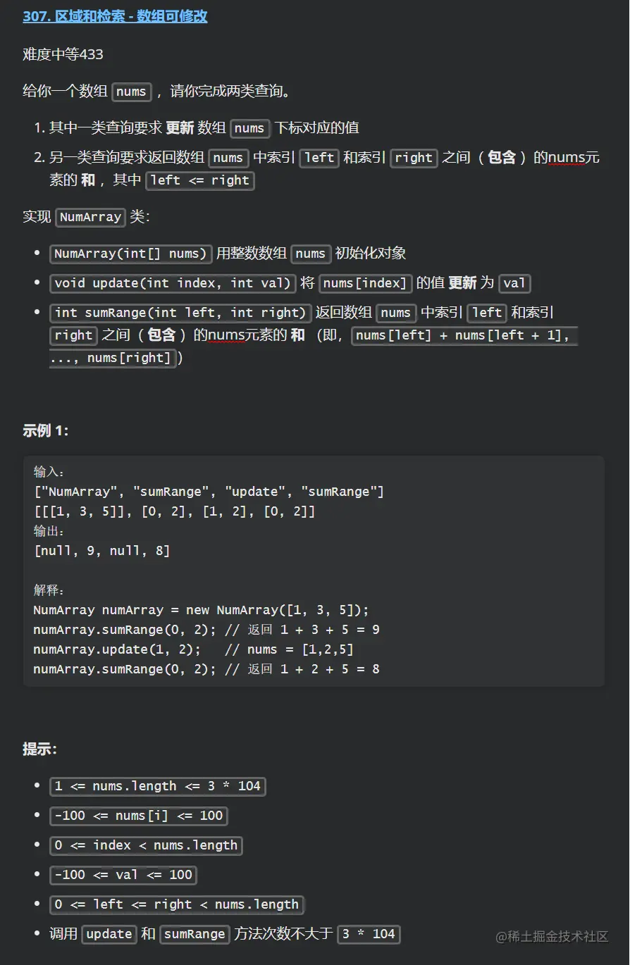 本次刷题日记的第 24 篇,力扣题为:307. 区域和检索 - 数组可修改 ,中等