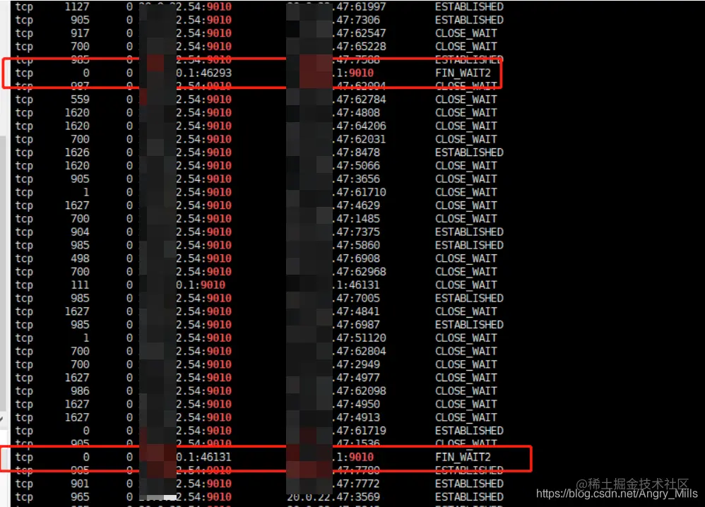 发现大量 close_wait,如图所示。这就是项目访问 502 的原因。