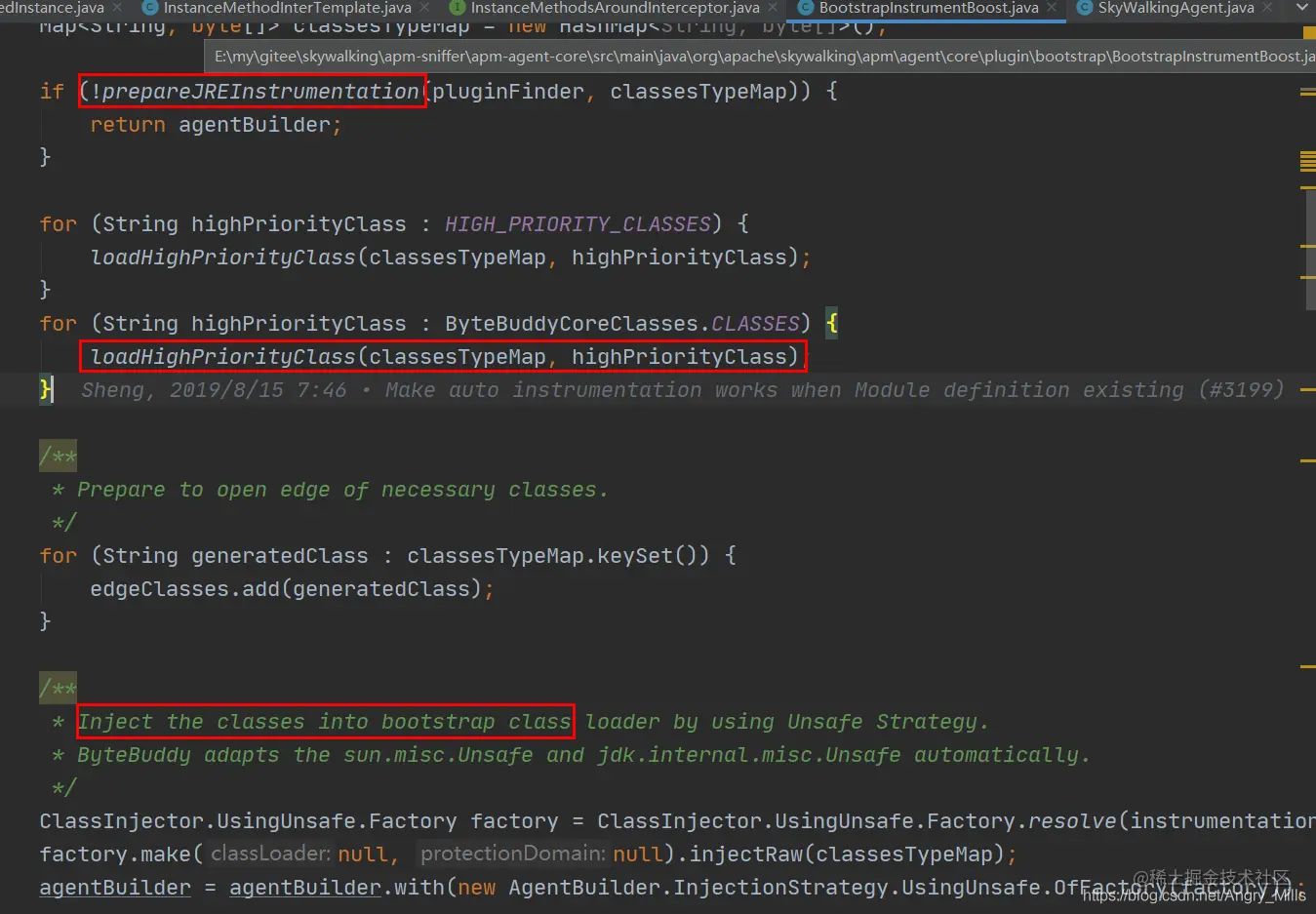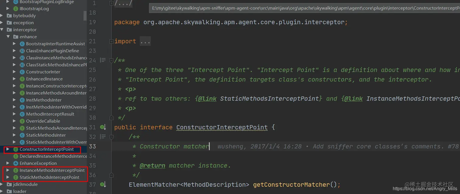这几个类是被放到启动类加载器加载。 InstanceMethodsAroundInterceptor INTERCEPTOR 这个变量是在 prepareJREInstrumentation 进行的初始化。至此这几个拦截模板会拦截所有的方法,如果是有拦截器的再按拦截的处理,否则直接放行。除了更好的异常处理、还可以传递参数就是 EnhancedInstance