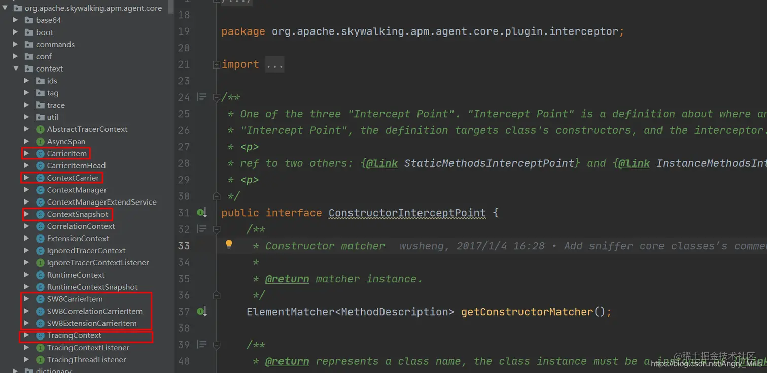 TracingContext 链路管理器,看一下类的注释吧。通过 ContextCarrier 和 ContextSnapshot 传递参数生成 TraceSegmentRef,利用的方法是 inject 和 extract (从前一个元素中获取参数)