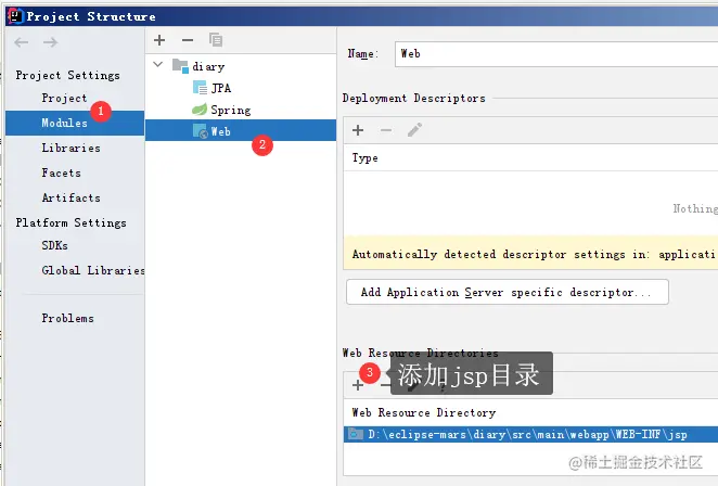 选择 下面的webapp,我们要保证文件夹的右下角有一个黄色的标记,这个代表资源目录。