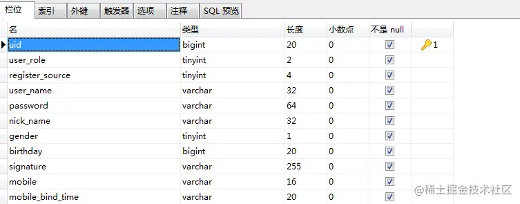 `uid` bigint(20) NOT NULL COMMENT '用户ID' ,