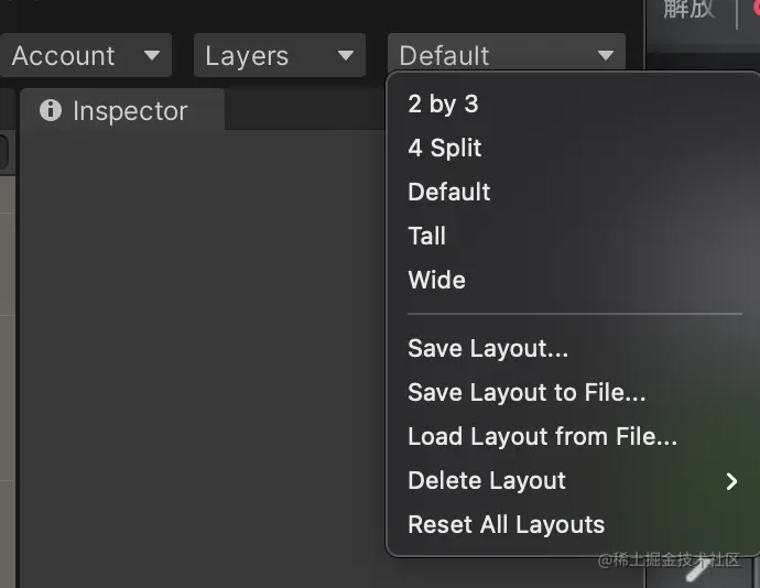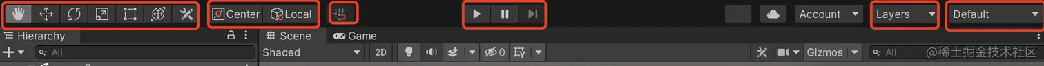控制编辑器界面布局。还能访问商店以及版本控制中心,包管理器,资源管理器等。