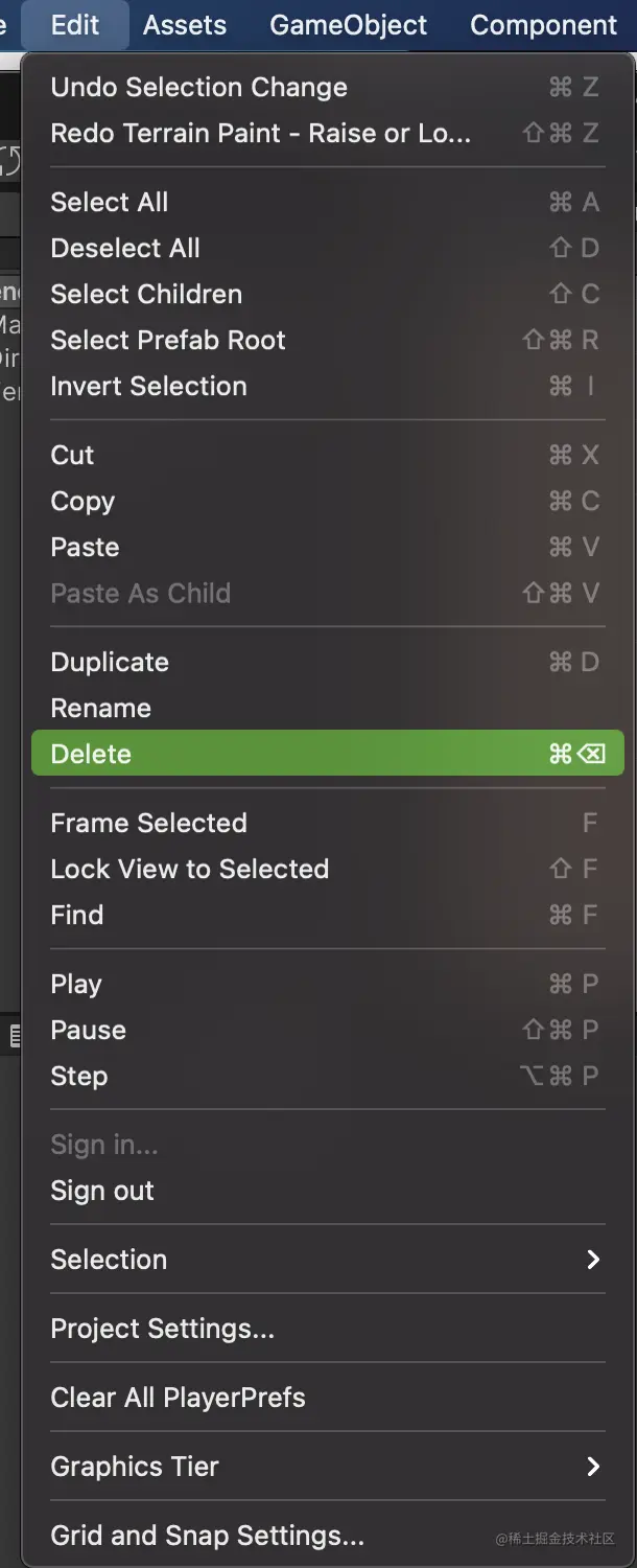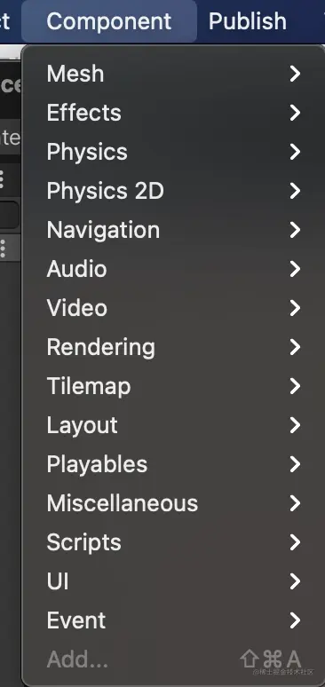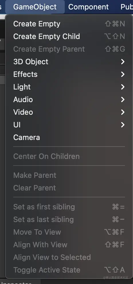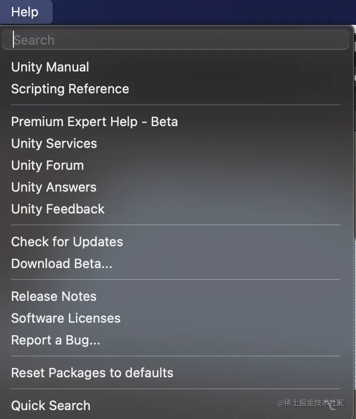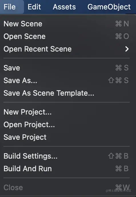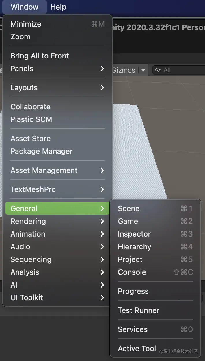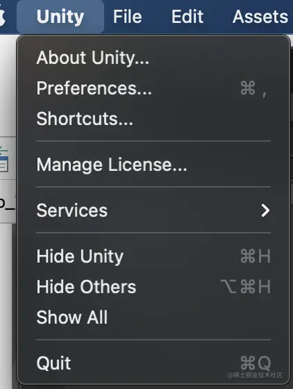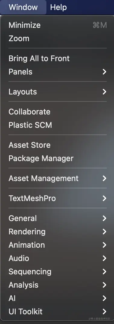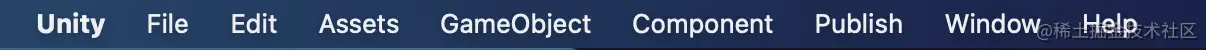 菜单栏集成了unity所有功能。