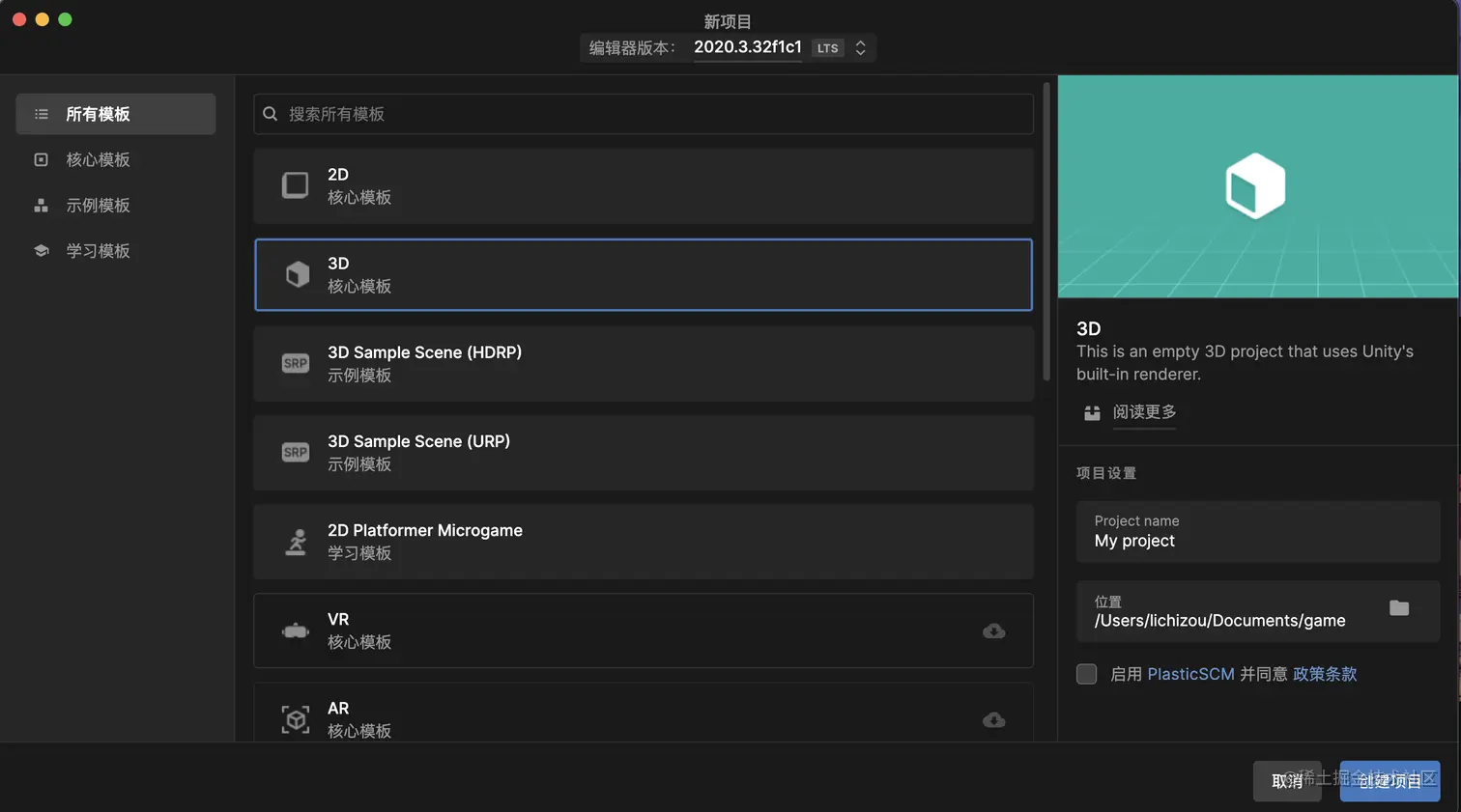 最上方可选择unity版本,右侧可选择项目位置和项目名称。启动PlasticSCM会利用该工具对项目进行版本控制。