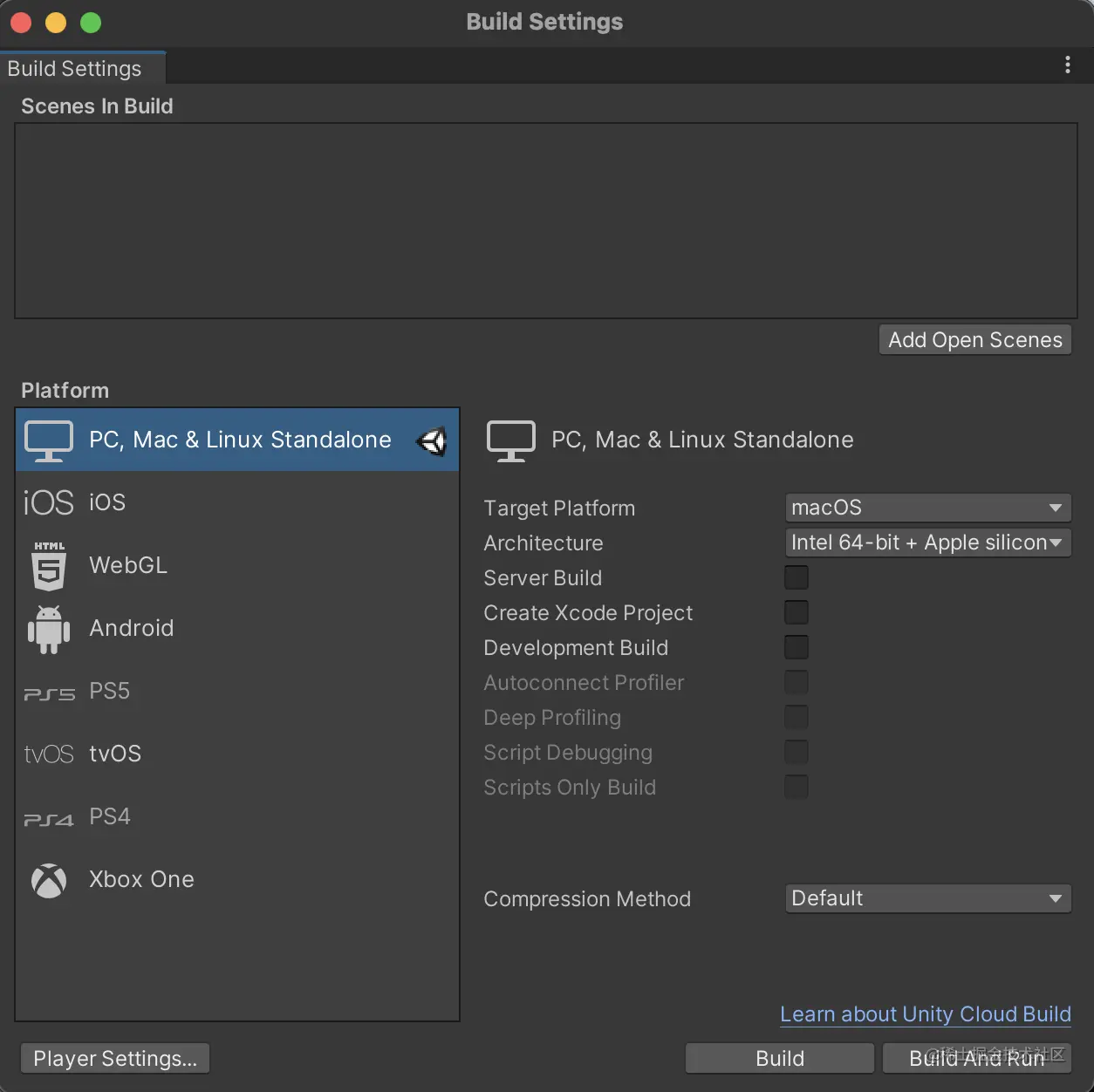 可选择发布到不同平台:记得先添加场景。
