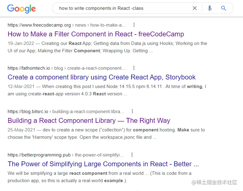 例如,搜索如何在React中编写组件 -class将返回所有没有 "class "一词的搜索结果: