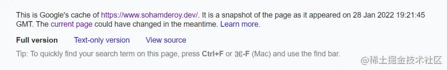 例如,在写这篇博客的当天,即2022年1月30日,搜索cache:www.sohamderoy.dev,得到的结果如下: