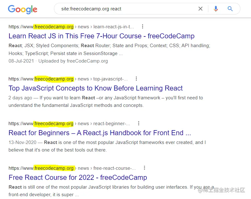 例如,搜索site:freecodecamp.org react将只从www.freecodecamp.org 网站上弹出关于react的搜索结果: