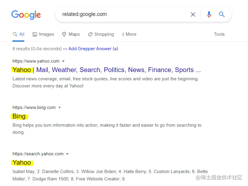 例如,进行related:google.com搜索,将获得所有与谷歌类似的网站,如Bing、Yahoo、DuckDuckGo等: