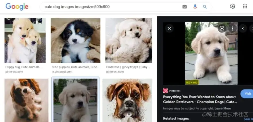 尺寸需要以像素为单位,例如,imagesize:500x500将弹出尺寸为500px x 500px的图像结果: