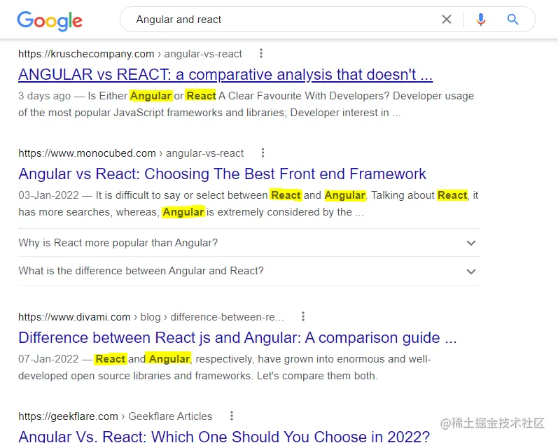 例如,进行React OR Angular搜索,将获得包含其中任何一个术语的结果,也可能是两个术语: