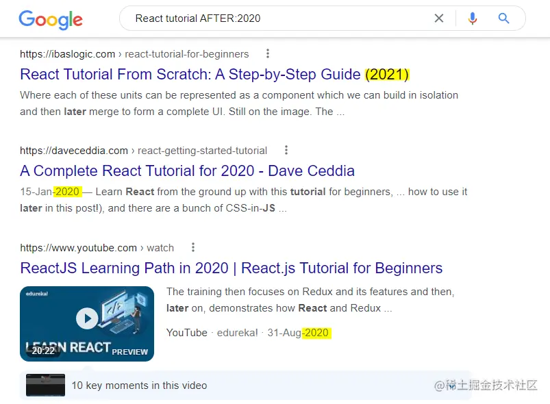 例如,React tutorials AFTER:2020的搜索将弹出2020年之后发布的搜索结果: