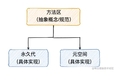 方法区和永久代以及元空间的关系很像 Java 中接口和类的关系,类实现了接口,这里的类就可以看作是永久代和元空间,接口可以看作是方法区,也就是说永久代以及元空间是 HotSpot 虚拟机对虚拟机规范中方法区的两种实现方式。