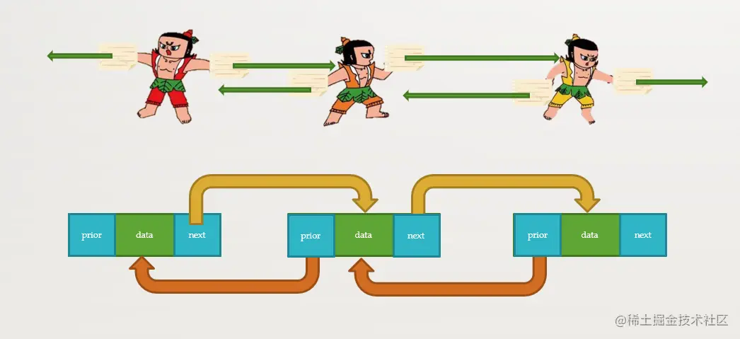故事中所表示的就是链式结构。我们再来思考一个问题,现在通过纸条可以找到下一个葫芦娃的房间,但是怎么找到上一个呢?好像不可以,稍微做一下修改,比如现在每个葫芦娃手上有两张纸条,另一张纸条上记录的是上一个葫芦娃的房间号。