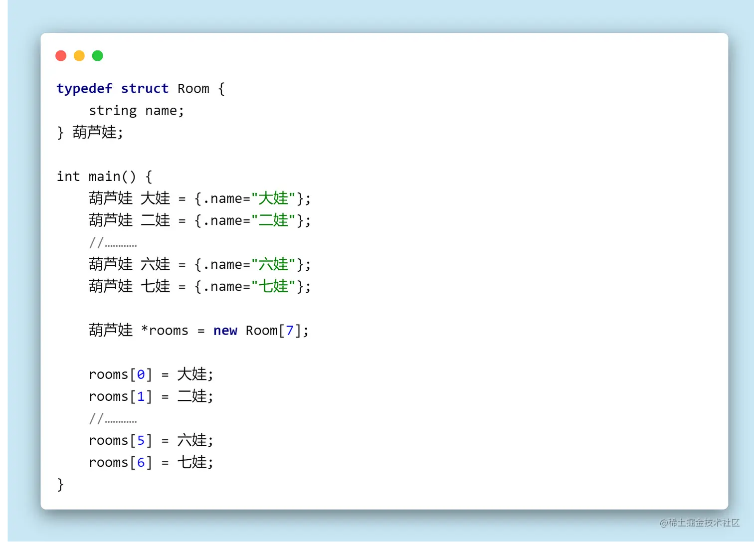 代码中,通过new关键字开辟了一个大小为7的数组,就相当于爷爷开了七个房间,然后向数组里存放了七个数据,相当于七个葫芦娃依次住进了各自的房间里。