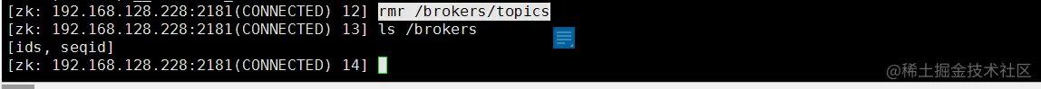 删除掉 zookeeper 中的 “ /kafka/brokers/topics” 的主题数据: