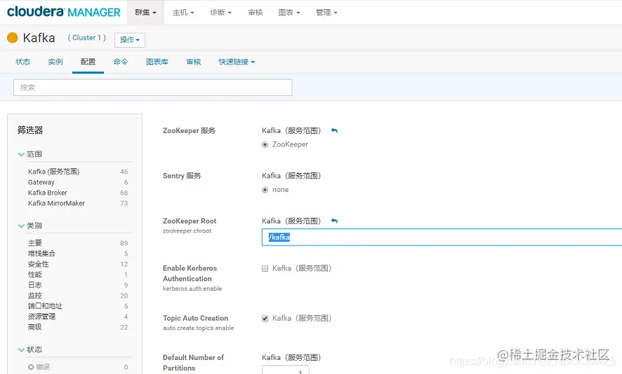 接下来测试topic指令,这里我们要先看CDH中配置的这个ZooKeeper Root的Kafka服务范围为: " /kafka "。