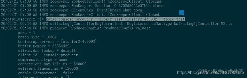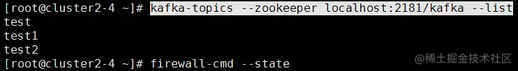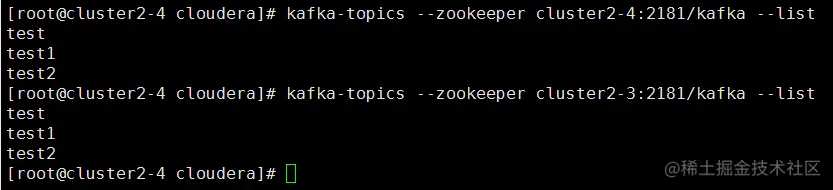 可以看到在2-4这台服务器中,我们后面输入 cluster2-4:2181/kafka 与 cluster2-3:2181/kafka 均可得到统一的信息。
