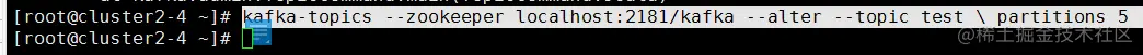 kafka-topics --zookeeper localhost:2181/kafka --alter --topic test \ partitions 5