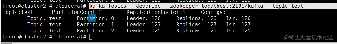 kafka-topics --zookeeper cluster2-4:2181/kafka --create -replication-factor 1 --partitions 3 --topic test