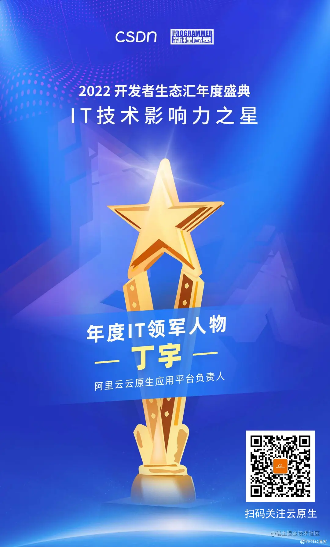 基于此,CSDN 和《新程序员》特别举办“开发者生态汇 —— 2022 IT 技术影响力之星”活动,表彰技术生态优秀代表,致敬推动行业发展的技术英雄们!经过近 4 个月的评选,最终各项获奖名单出炉。其中,阿里巴巴研究员、阿里云智能云原生应用平台负责人丁宇(花名:叔同)获得年度 IT 领军人物。